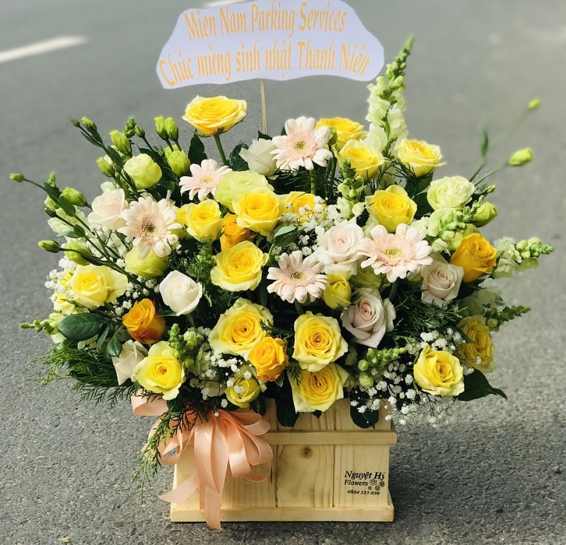 Một lẵng hoa khai trương có gam màu vàng chủ đạo là lời chúc về tiền tài, phát triển thuận lợi trong công việc làm ăn. Một số loại hoa được dùng phổ biến như hoa hướng dương, cúc, hoa hồng vàng. Nhờ sự rực rỡ của các bông hoa này đem lại, đã tăng được phần tươi tắn cho buổi khai trương.
